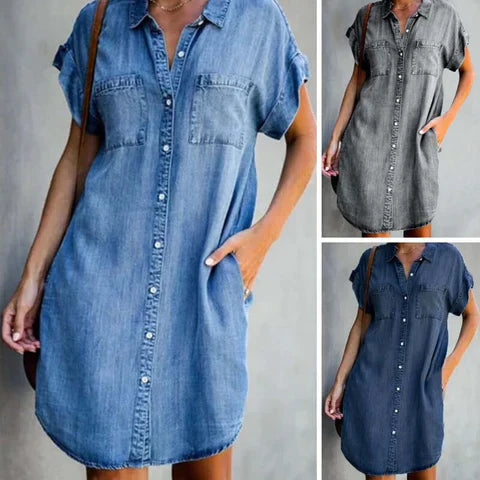 "Jurk van denim - Zula: Deze modieuze jurk van robuust denim combineert nonchalantheid en stijl. Perfect voor een trendy en relaxte look."